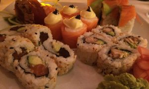Seared tuna roses (4), California rolls (8), Seared tuna roses (4), California rolls (8), firecracker rolls (8), salmon nigiri (2) firecracker rolls (8), salmon nigiri (2)
